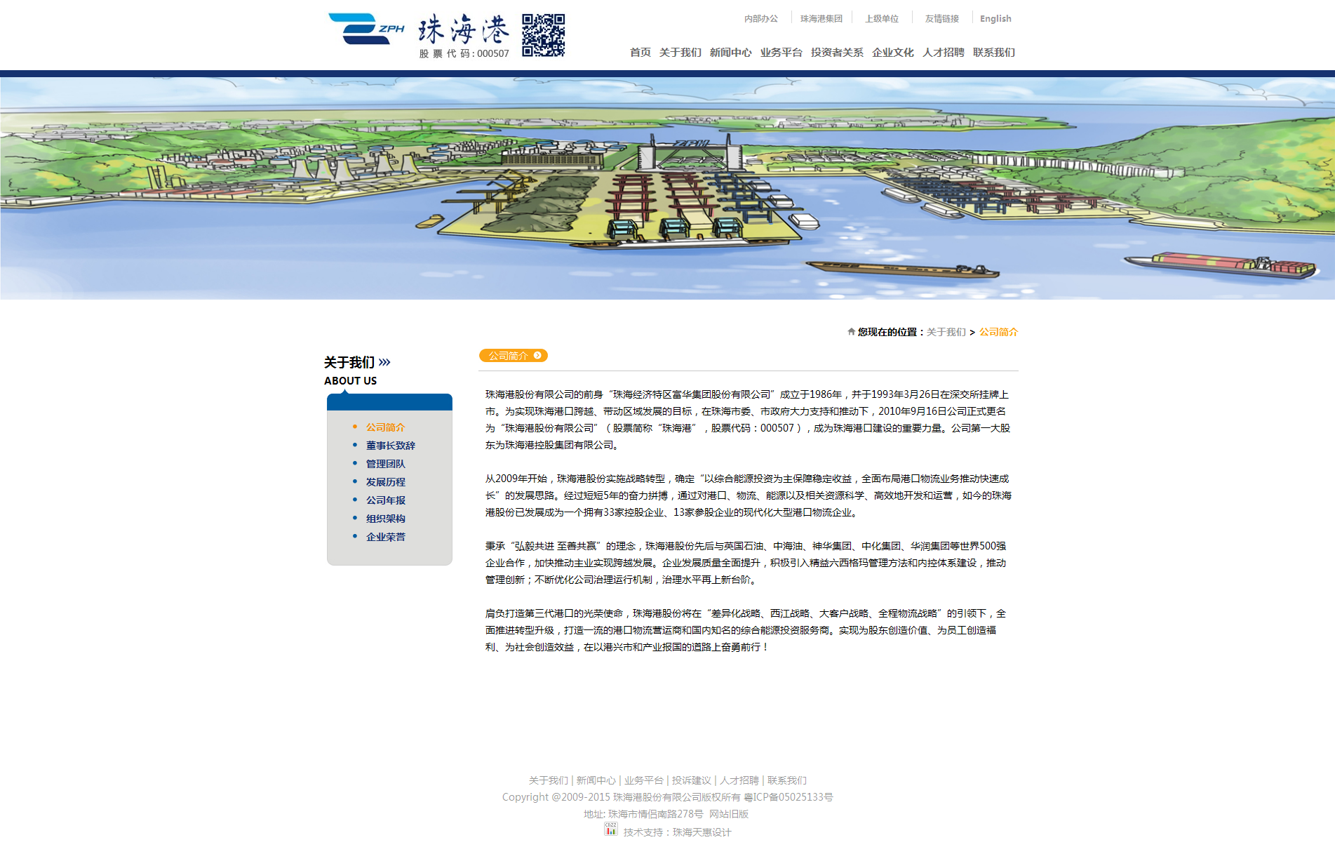 珠海港股份有限公司的前身是珠海經(jīng)濟特區(qū)富華集團股份有限公司。1989年4月8日公司正式向公眾發(fā)行股票,成為珠海市首批發(fā)行股票企業(yè)。1993年3月26日經(jīng)中國證券監(jiān)督委員會和深圳證券交易所核準,公司股票在深交所正式掛牌上市,成為廣東省首家異地上市公司。公司股票簡稱珠海港股份,股票代碼000507,總股本為344,997,420股,目前公司的實際控制人珠海港控股集團有限公司(持有珠海港股份56,568,194股股份,占公司總股本的16.4%,為第一大股東)。